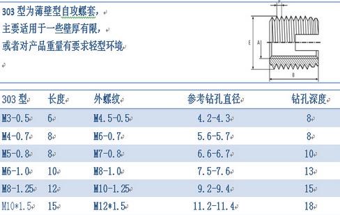 24h咨询热线13069364703在线咨询 薄壁型自攻螺套外观上看主要有两种区分,一种是一端开槽型的,另一种是一端三圆孔型的,其中开圆孔型的又分为307型和308型两种,307型和308型外观主要区别就是同一直径下,长度和外径大小有所区分。以上各种型式螺套均具有自行攻牙功能。